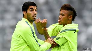 Luis Suárez y Neymar muestran la buena relación que hay en el ataque del Barcelona, formado por un uruguayo, un brasileño y un argentino.